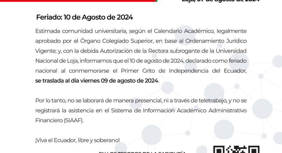 Comunicado Oficial | Feriado 10 de Agosto de 2024