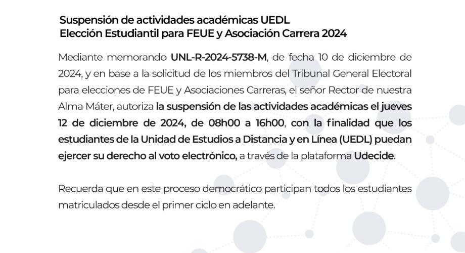 Comunicado Oficial Nro.040 | Suspensión de actividades académicas UEDL | VOTACIONES FEUE Y ASOCIACIONES CARRERAS UNL