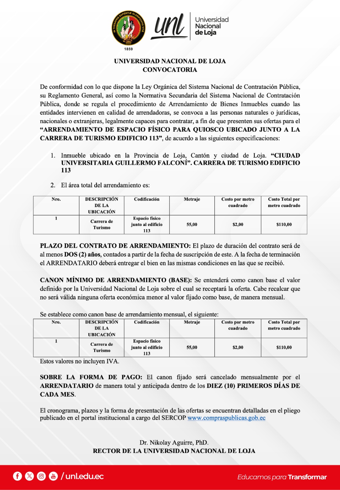 De acuerdo con el Pliego de Licitación Internacional elaborados por la UNIVERSIDAD NACIONAL DE LOJA (UNL), y aprobados por el Ing. Nikolay Aguirre PhD, en su calidad de Rector, se convoca a las personas naturales o jurídicas, extranjeras, asociaciones de éstas o consorcios o compromisos de asociación o bajo cualquier relación comercial, legalmente capaces para contratar, a que presenten su oferta para la ADQUISICIÓN DE UN EQUIPO DE EEG PARA EL PROYECTO INTERFAZ CEREBRO-COMPUTADOR NO-INVASIVA PARA EL ANÁLISIS DE CONECTIVIDAD CEREBRAL Y LOCALIZACIÓN DE FUENTES DURANTE LA IMAGINACIÓN DE MOVIMIENTO.