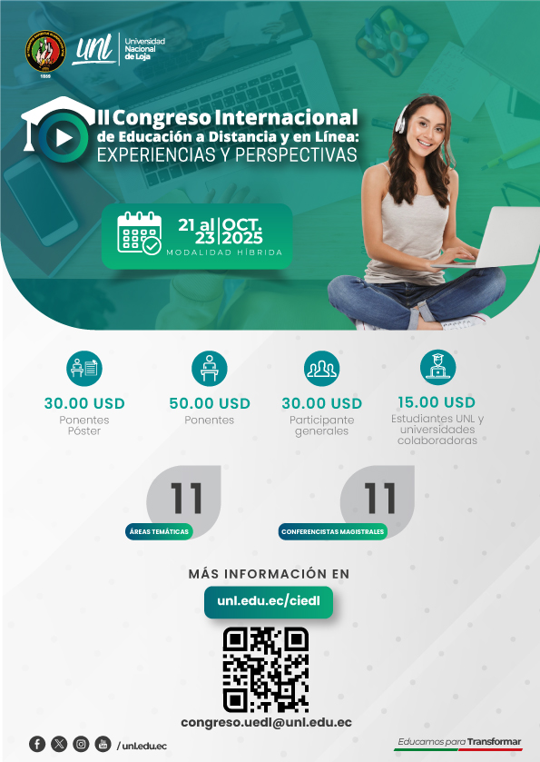 El II Congreso Internacional de Educación a Distancia y en Línea: Experiencias y perspectivas, proviene de una iniciativa al cumplirse los 27 años de la Unidad de Educación a Distancia de la Universidad Nacional de Loja y está constituido por un conjunto de actividades divulgativas y académicas, entre las que constan conferencias magistrales, ponencias y exposición de pósteres. Cada una de estas actividades será desarrollada por especialistas en las áreas y coordinadas por la Unidad de Educación a Distancia y en Línea. Como eje central del evento se plantea la socialización de los resultados de procesos investigativos con alta significación en los ámbitos de las diferentes áreas del conocimiento.