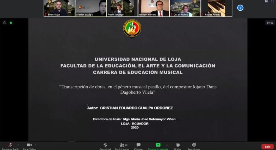 La Universidad Nacional de Loja entregó al país un nuevo profesional en la música. Cristian Eduardo Gualpa Ordoñez, obtuvo el título de Licenciado en Ciencias de la Educación mención en Educación Musical con la disertación de la tesis: “Transcripción de obras, en el género musical pasillo, del compositor lojano Dans Dagoberto Vilela”.