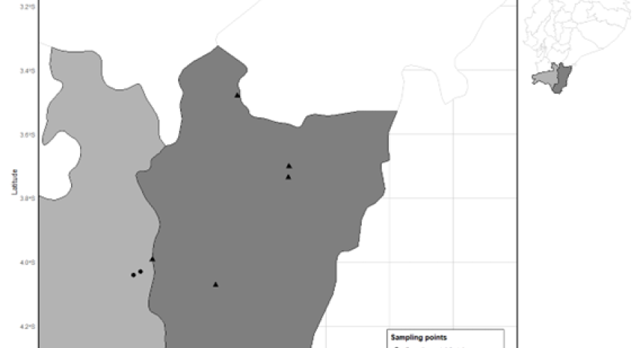 FIG. | Lugares de muestreo, distribuidos entre las provincias de Loja (gris claro) y Zamora Chinchipe (gris oscuro)