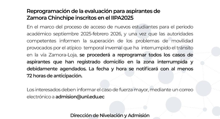 REPROGRAMACIÓN DE EVALUACIÓN PARA ASPIRANTES DE ZAMORA CHINCHIPE INSCRITOS EN EL  IIPA2025