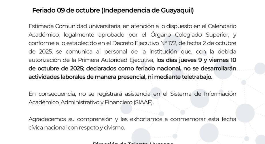 Comunicado Oficial Nro. 056 |  Feriado 09 y 10 de octubre | Independencia de Guayaquil