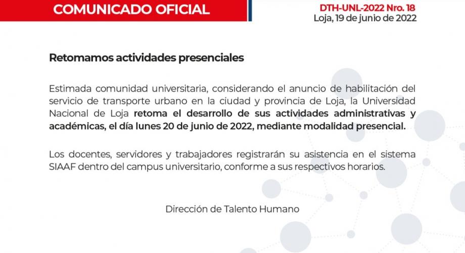 UNL suspende sus actividades presenciales y se acoge a la modalidad virtual el día martes 21 de junio de 2022
