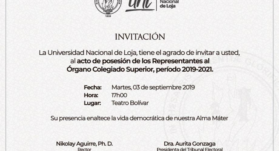 La Universidad Nacional de Loja, tiene el agrado de invitar a usted, al Acto de posesión de los Representantes al Órgano Colegiado Superior, período 2019-2021.