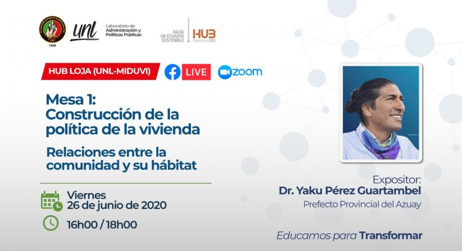 Dentro de la planificación del HUB Loja 2020, llevado a cabo por la UNL y el Miduvi, se invita a la ciudadanía en general a participar en la Mesa 1: Construcción de la política de vivienda, con el tema: Relaciones entre la comunidad y su hábitat.