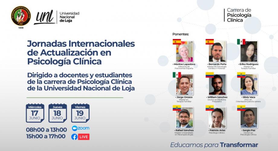 La carrera de Psicología Clínica de la Universidad Nacional de Loja, invita a estudiantes y profesionales de esta rama, y a la ciudadanía en general, a las Jornadas Internacionales de Actualización de Psicología Clínica, en las cuales se abordará: