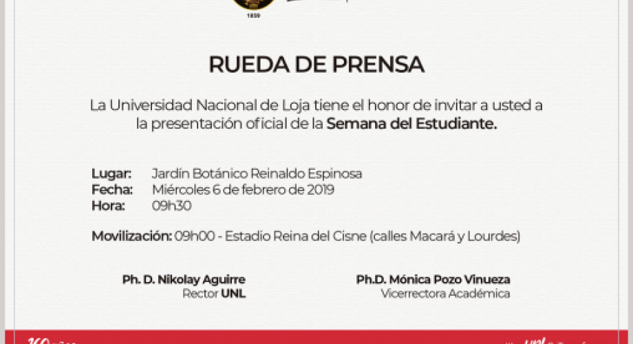 La Universidad Nacional de Loja en el marco de sus actividades académicas, organizará la Semana del Estudiante del 11 al 15 de febrero, con la participación de todo el estamento universitario.