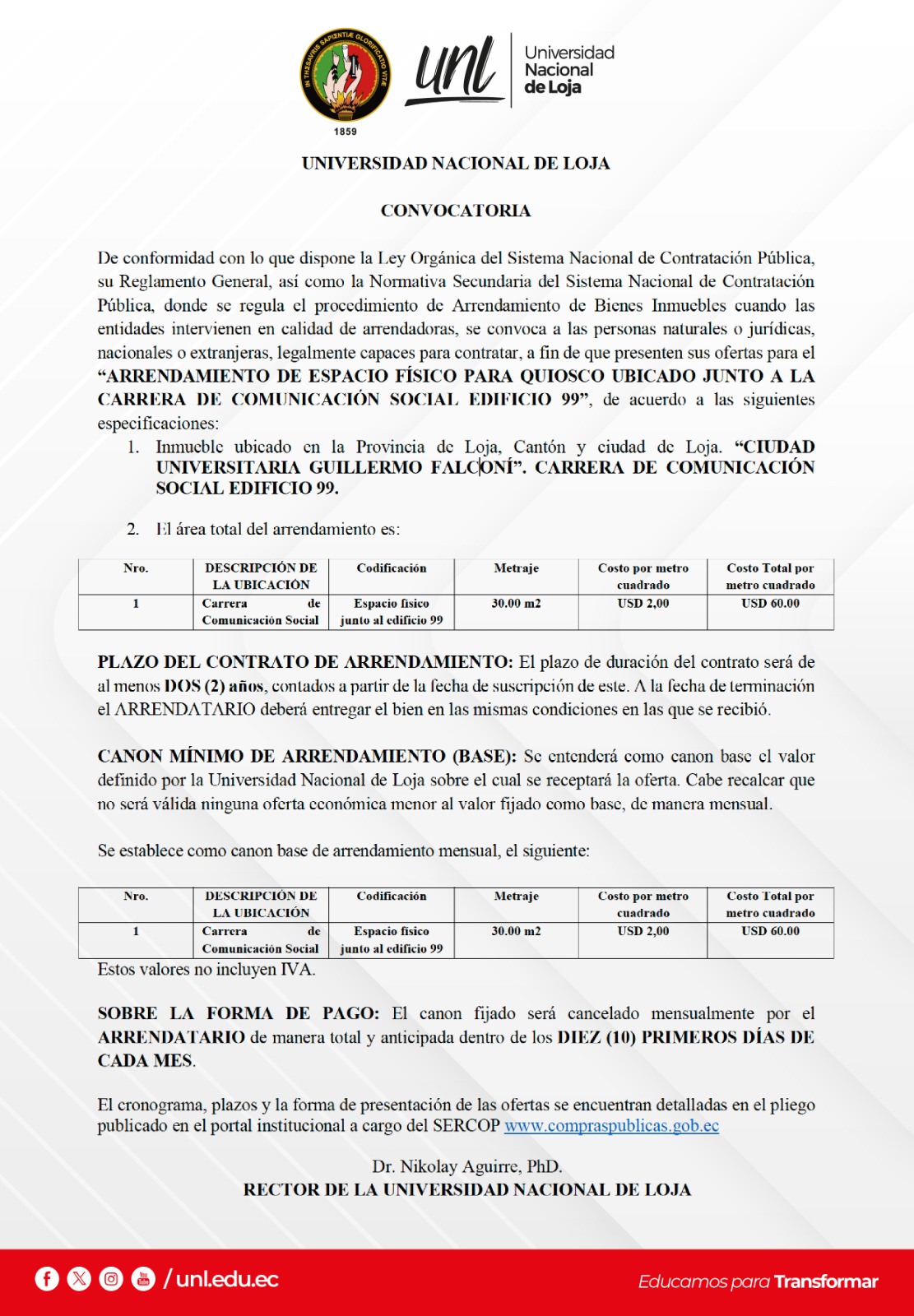 De acuerdo con el Pliego de Licitación Internacional elaborados por la UNIVERSIDAD NACIONAL DE LOJA (UNL), y aprobados por el Ing. Nikolay Aguirre PhD, en su calidad de Rector, se convoca a las personas naturales o jurídicas, extranjeras, asociaciones de éstas o consorcios o compromisos de asociación o bajo cualquier relación comercial, legalmente capaces para contratar, a que presenten su oferta para la ADQUISICIÓN DE UN EQUIPO DE EEG PARA EL PROYECTO INTERFAZ CEREBRO-COMPUTADOR NO-INVASIVA PARA EL ANÁLISIS DE CONECTIVIDAD CEREBRAL Y LOCALIZACIÓN DE FUENTES DURANTE LA IMAGINACIÓN DE MOVIMIENTO.