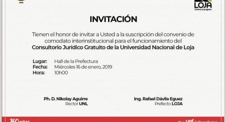 La Universidad Nacional de Loja (UNL) junto con el Gobierno Provincial de Loja realizarán la suscripción del comodato interinstitucional para el funcionamiento del Consultorio Jurídico Gratuito de la UNL.